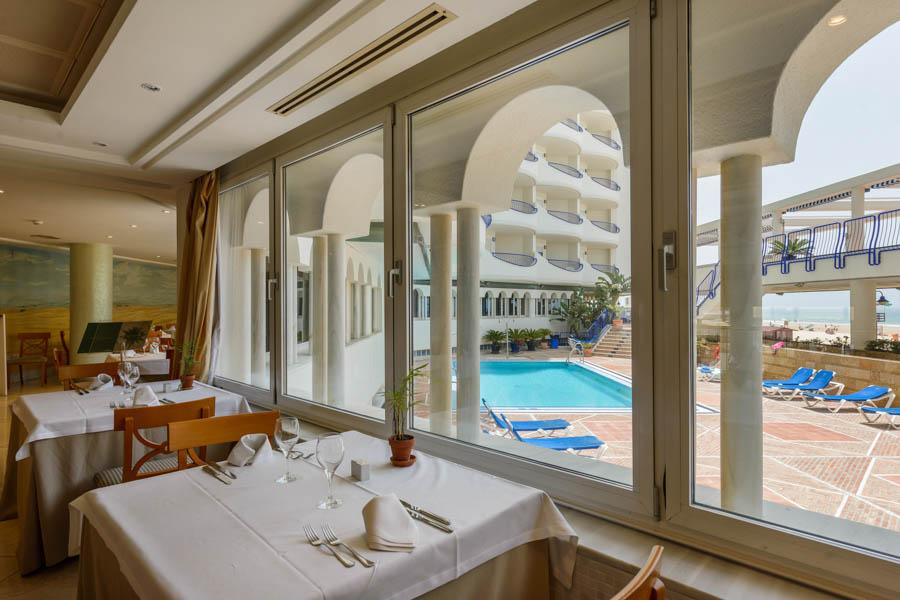 On the first floor is the breakfast hall, with panoramic windows offering views of the swimming pool and the beach.