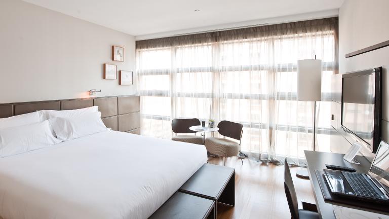Las habitaciones del hotel Reina Petronila son todas exteriores y con amplios ventanales, lo que permite una buena iluminación natural, con un diseño tipo loft a lo que se le añade un cuidado mobiliario y decoración. Los colores principales varían en función de la altura de planta y la orientación, optimizando la luminosidad de la habitación, siempre aportando una atmósfera cálida y agradable.